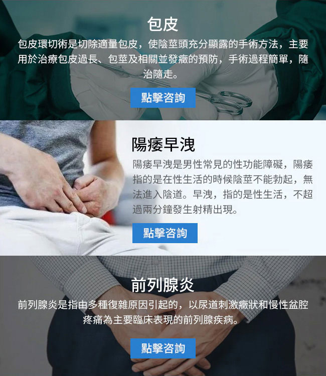 楊正忠 主治醫師 擅長: 擅長陽痿、早泄,(慢性前列腺炎、非淋性尿道炎、龜頭炎,念珠菌及陰虱病等)。(包皮包莖美容術、陰莖短小延長增粗術 諮詢